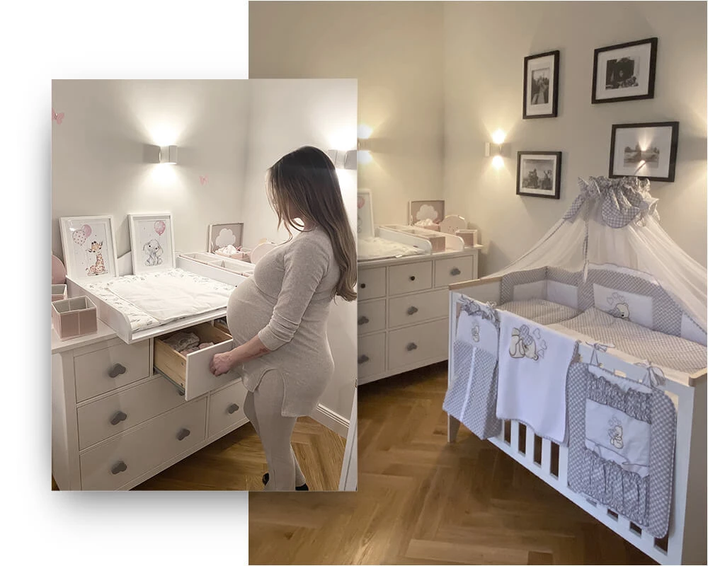 Wir freuen uns dir einen Einblick in Anna-Marias Babyzimmer geben zu dürfen. In dem behaglichen Zimmer findest du unseren praktischen Wickelaufsatz "Noah“ mit zusätzlicher Ablage für alle benötigten Babyutensilien. Passend dazu hat sich Anna-Maria unsere Wickelauflage "Flora“ in zarten Mint- und Grüntönen ausgesucht. Die Mädchen brauchen viel Platz. Dazu eignen sich unsere massiven Kleiderschränke "Carlotta“ mit viel Staufläche im schicken skandinavischen Hausdesign bieten. Einen sicheren und heimeligen Ort zum Schlafen finden die drei Mädels in unseren "Ida“ Babybetten. Ergänzend hierzu schafft das aus reiner OEKO-TEX Baumwolle produzierte Babynest "Flora“ mit tollen Funktionen, wie abnehmbarer Bettschlange und komfortabler Matratze, zusätzliche Geborgenheit. Damit die besten Kleidungsstücke der kleinen Prinzessinnen ihren passenden Auftritt bekommen, hat Anna-Maria unsere süße Kleiderstange "Svetjé“ mit Herz-Ausschnitt zauberhaft dekoriert.