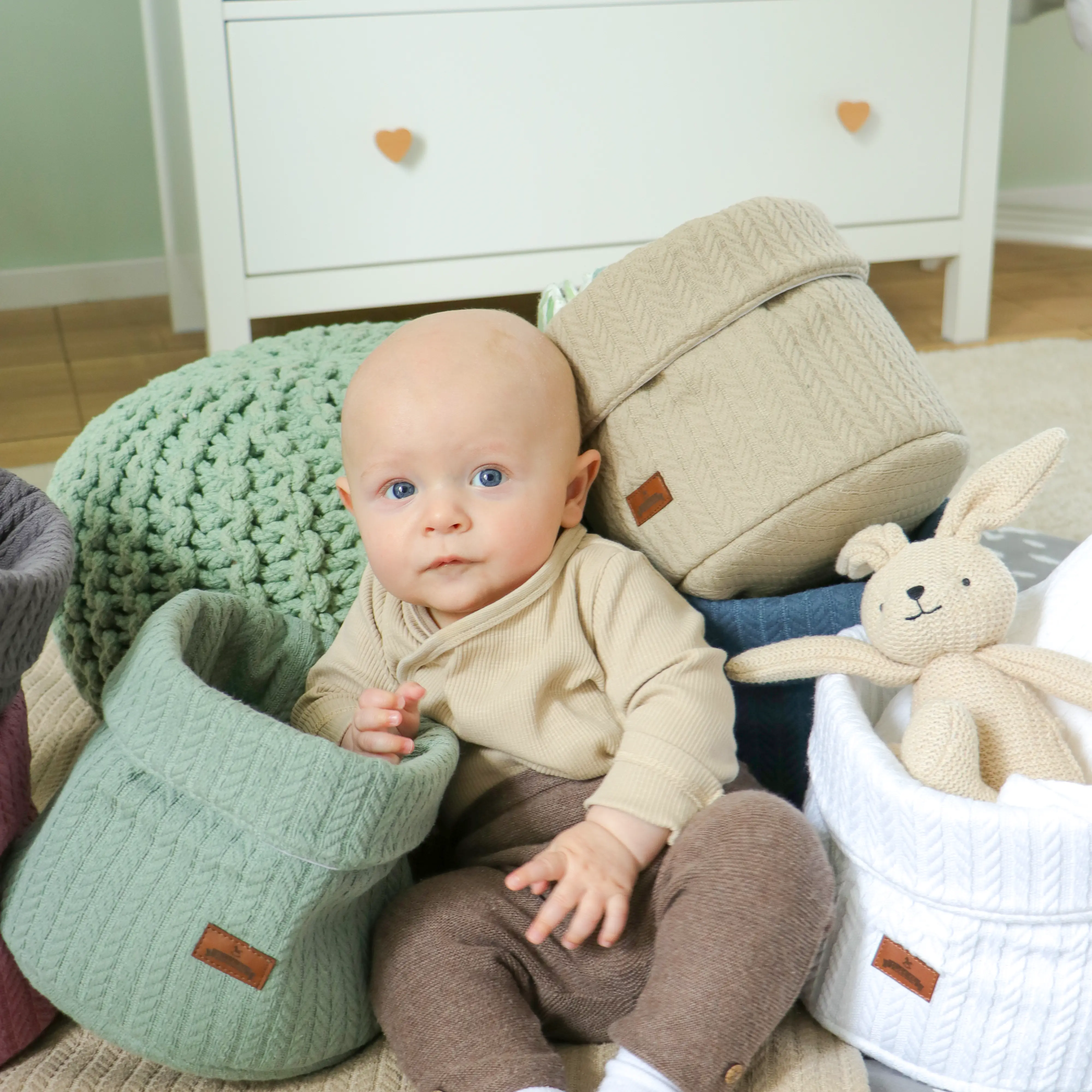 Der praktische Aufbewahrungskorb Leevke im Zopfstrickmuster bietet nicht nur ausreichend Platz für Wickelutensilien auf der Wickelkommode, sondern ist auch als praktischer Organizer im Badezimmer oder für Spielzeug nicht wegzudenken. Hier können bequem Kosmetik- oder Baby-Pflegeutensilien und Spielzeuge verstauen werden.