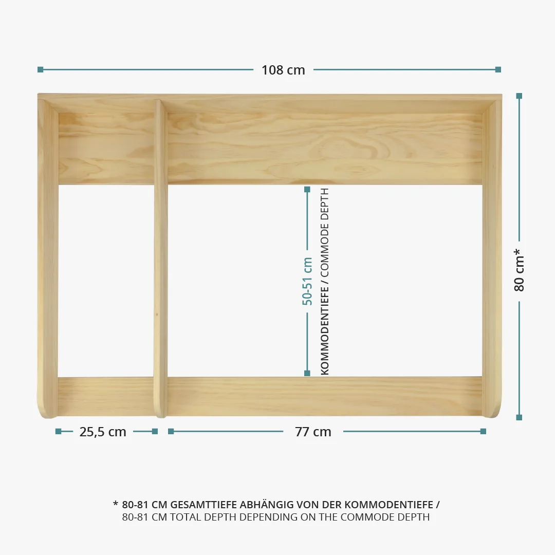 Der Wickelaufsatz in natur mit abgerundeten Kanten schließt bündig mit der Kommode ab und verfügt über ein Trennfach, welches sowohl rechts als auch links angebracht werden kann. So sind alle wichtigen Wickelutensilien immer gut organisiert und griffbereit. Mit einer Liegefläche von 77x78 cm bietet der Wickelaufsatz viel Platz beim Wickeln. Der Wickelaufsatz im XXL-Format lässt sich besonders gut mit anderen Artikeln mit Holz-Optik kombinieren.
