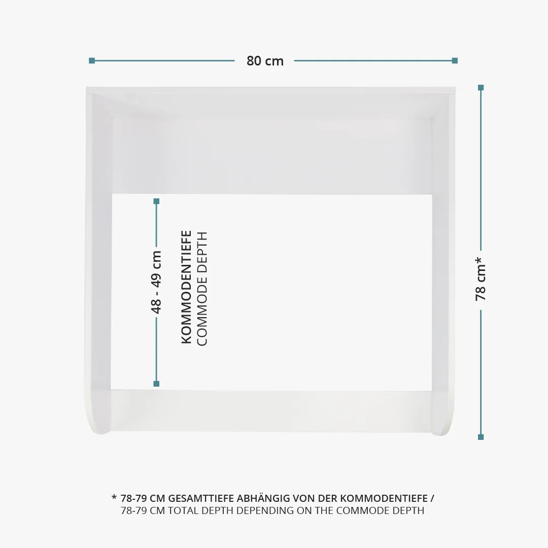 Der weiß lackierte Wickelaufsatz mit abgerundeten Kanten schließt bündig mit der Kommode ab. Mit einer Liegefläche von 77x76 cm bietet der Wickelaufsatz viel Platz beim Wickeln. Der Wickelaufsatz lässt sich besonders gut mit unseren Wickelauflagen in der Größe "standard" kombinieren. Die extra hohen Seitenteile mit 15 cm bieten einen zusätzlichen Schutz für sehr aktive Babys.