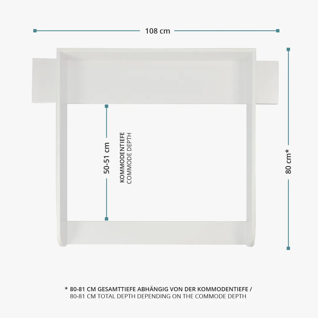Dank der integrierten Blende schließt der Wickelaufsatz bündig mit der Wand und der Kommode ab und schafft zusätzliche Ablagefläche. Der weiß lackierte Wickelaufsatz verfügt über abgerundete Kanten. Mit einer Liegefläche von 77x78 cm bietet der Wickelaufsatz viel Platz beim Wickeln. Der Wickelaufsatz mit Blende lässt sich besonders gut mit unseren Wickelauflagen in der Größe "standard" kombinieren.