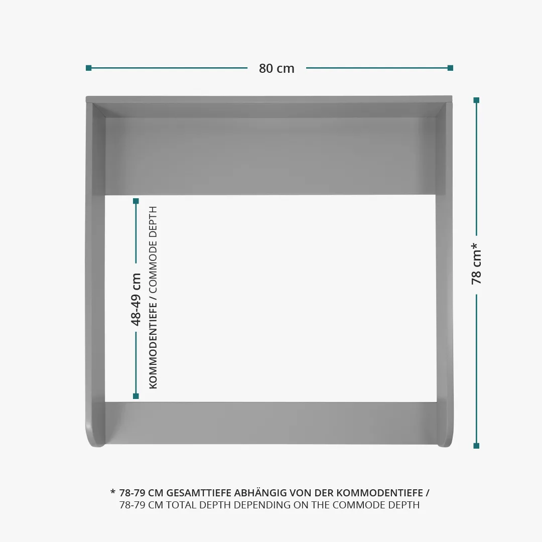 Der grau lackierte Wickelaufsatz mit abgerundeten Kanten schließt bündig mit der Kommode ab. Mit einer Liegefläche von 77x76 cm bietet der Wickelaufsatz viel Platz beim Wickeln. Der Wickelaufsatz lässt sich besonders gut mit unseren Wickelauflagen in der Größe "standard" kombinieren.
