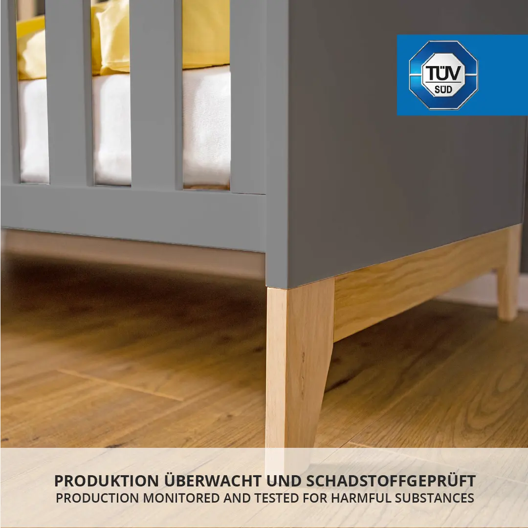 Das Babybett Ida ist ein hochwertig verarbeitetes Gitterbett aus MDF- und Kiefernholz. Durch die Kombination aus grau lackiertem und naturbelassenem Kiefernholz lässt sich das Bett gut mit verschiedenen Kinderzimmereinrichtungen kombinieren.