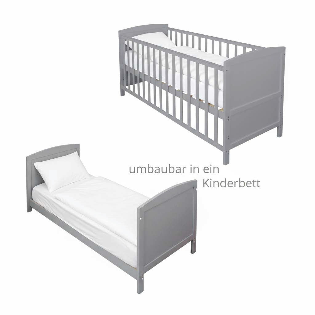 Das Babybett Mika 70x140 in grau ist umbaubar und mitwachsend. Das hochwertig verarbeitete Gitterbett aus grau lackiertem Holz lässt sich gut mit verschiedenen Kinderzimmereinrichtungen kombinieren.