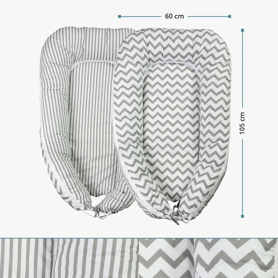 Das Babynest Svea im Wendedesign mit Chevron und Streifen ist ein richtiges Multitalent und verfügt über eine Reißverschluss-, Klett- und Zugband-Funktion. Dadurch ist das Babynest noch vielseitiger einsetzbar und einfacher zu pflegen.
