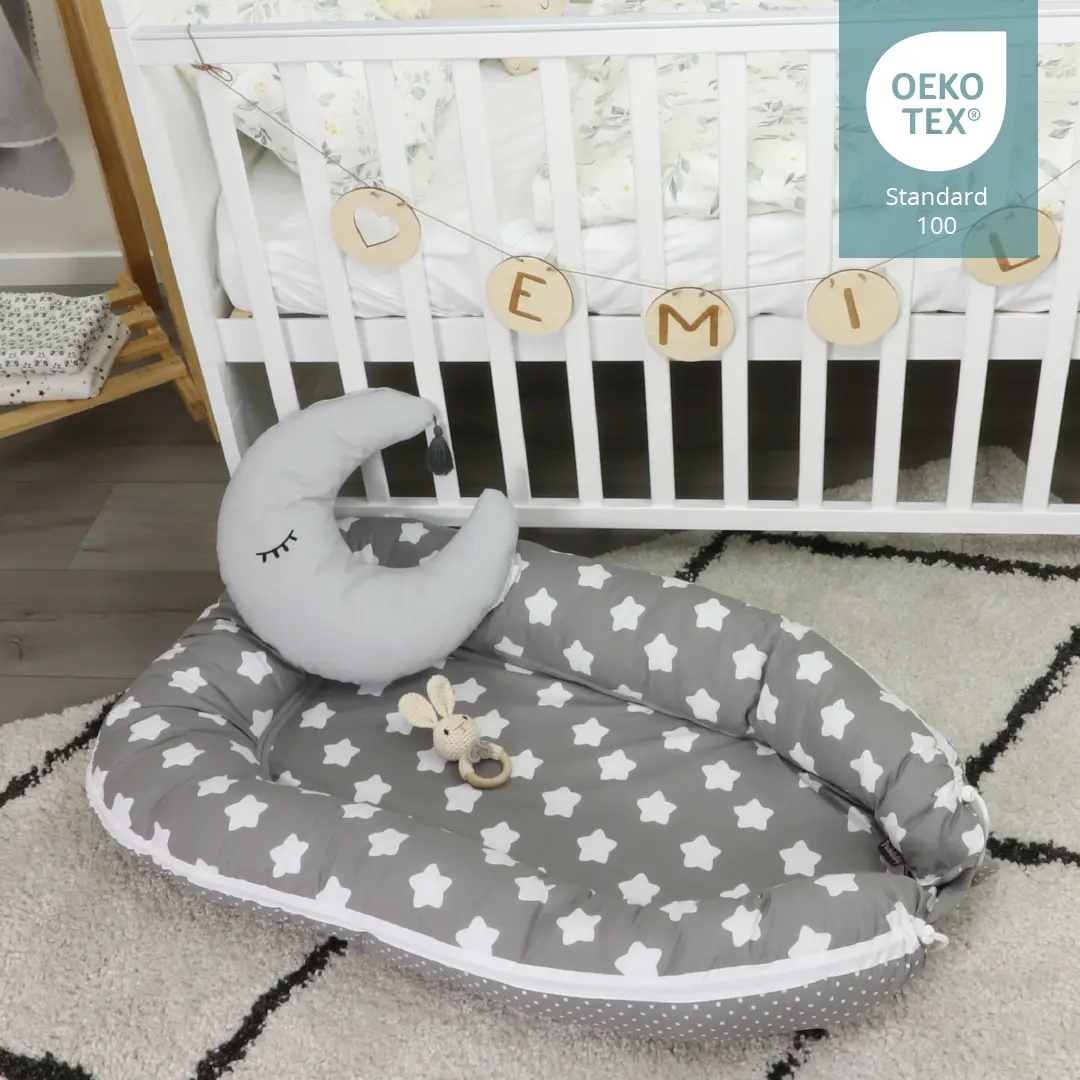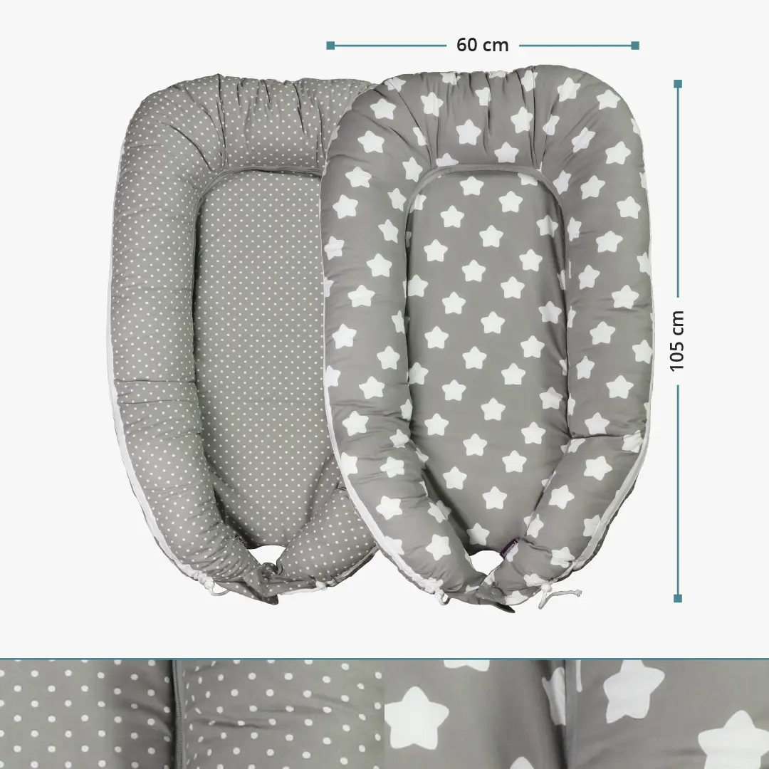 Das Babynest Finja im Wendedesign mit Sternen und Pünktchen ist ein richtiges Multitalent und verfügt über eine Reißverschluss-, Klett- und Zugband-Funktion. Dadurch ist das Babynest noch vielseitiger einsetzbar und einfacher zu pflegen.