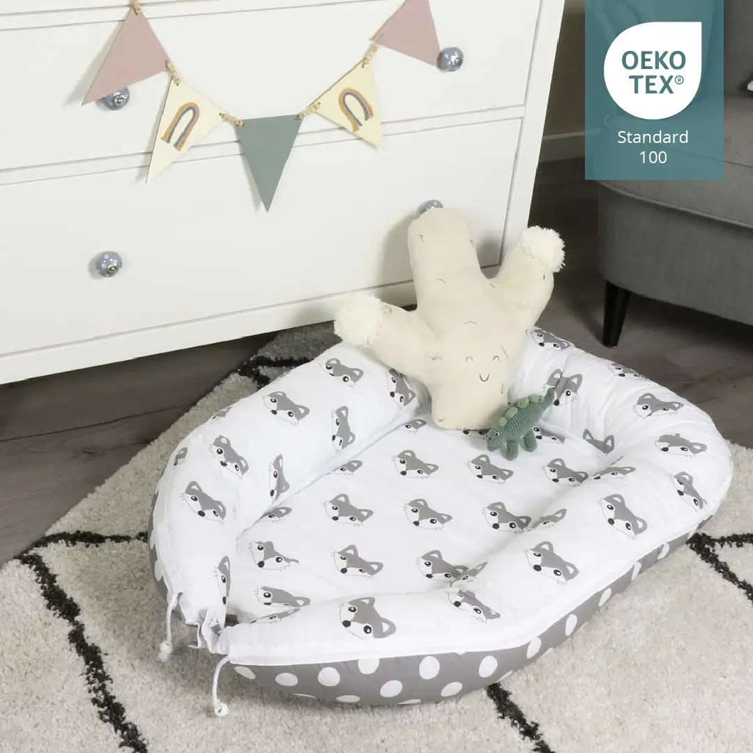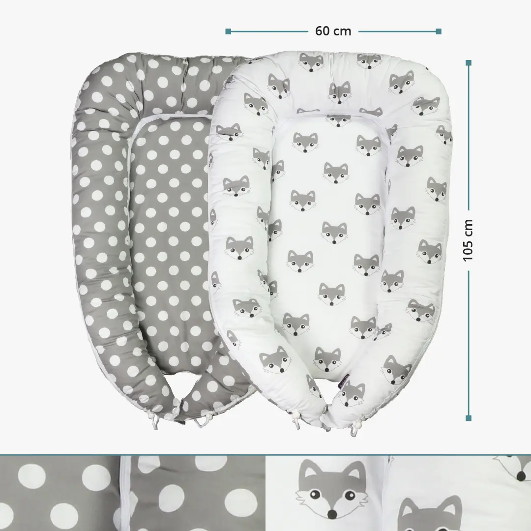 Das Babynest Foxi im Wendedesign mit Fuchs-Motiv und Punkten ist ein richtiges Multitalent und verfügt über eine Reißverschluss-, Klett- und Zugband-Funktion. Dadurch ist das Babynest noch vielseitiger einsetzbar und einfacher zu pflegen.