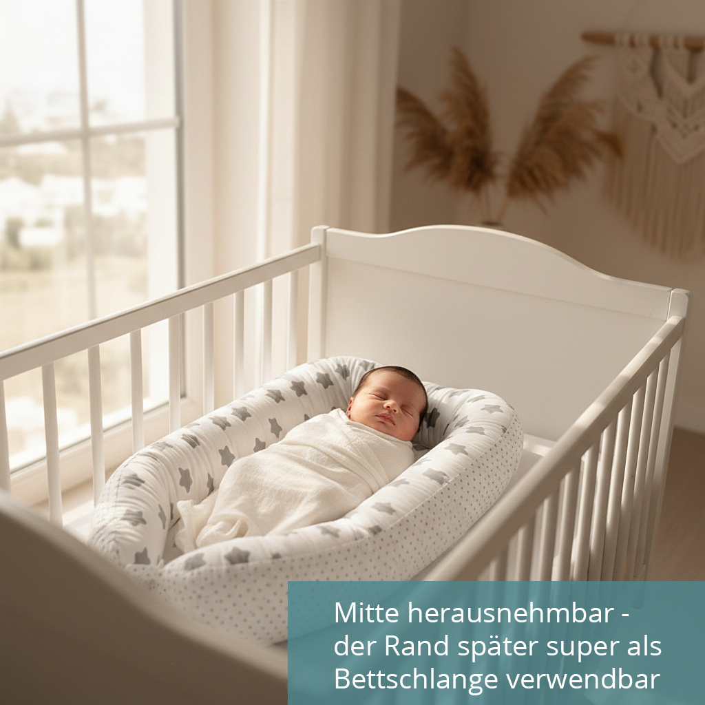 Als komfortables und kuscheliges Highlight ist ein Babynest eine tolle Alternative zum Stubenwagen. Auf dem Sofa, im Kinderwagen, in der Wiege oder auch im Elternbett platziert, ist das Baby immer im Blick. Im Babynest fühlen sich Säuglinge besonders geborgen und werden zusätzlich in ihrer Liegeposition durch die gepolsterten Seitenteile schützend gestützt.