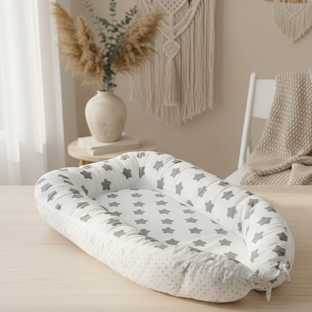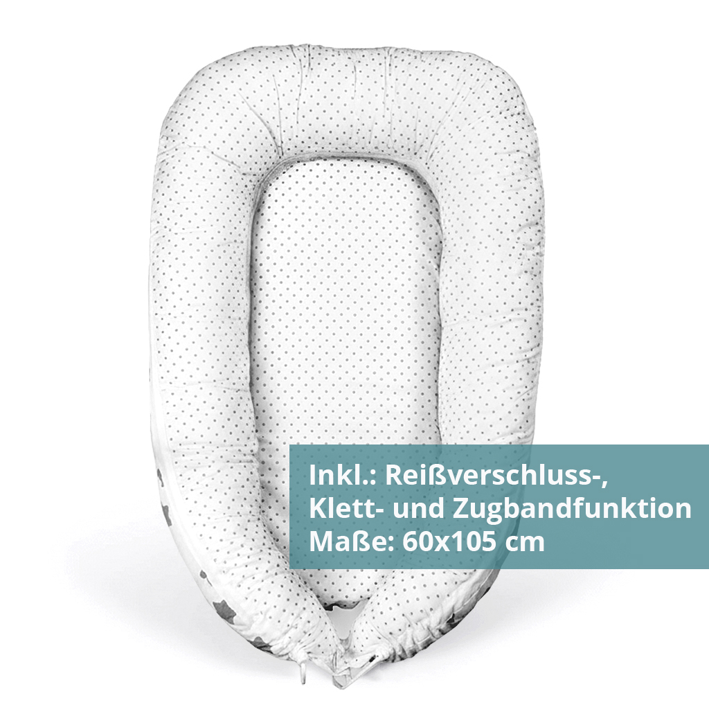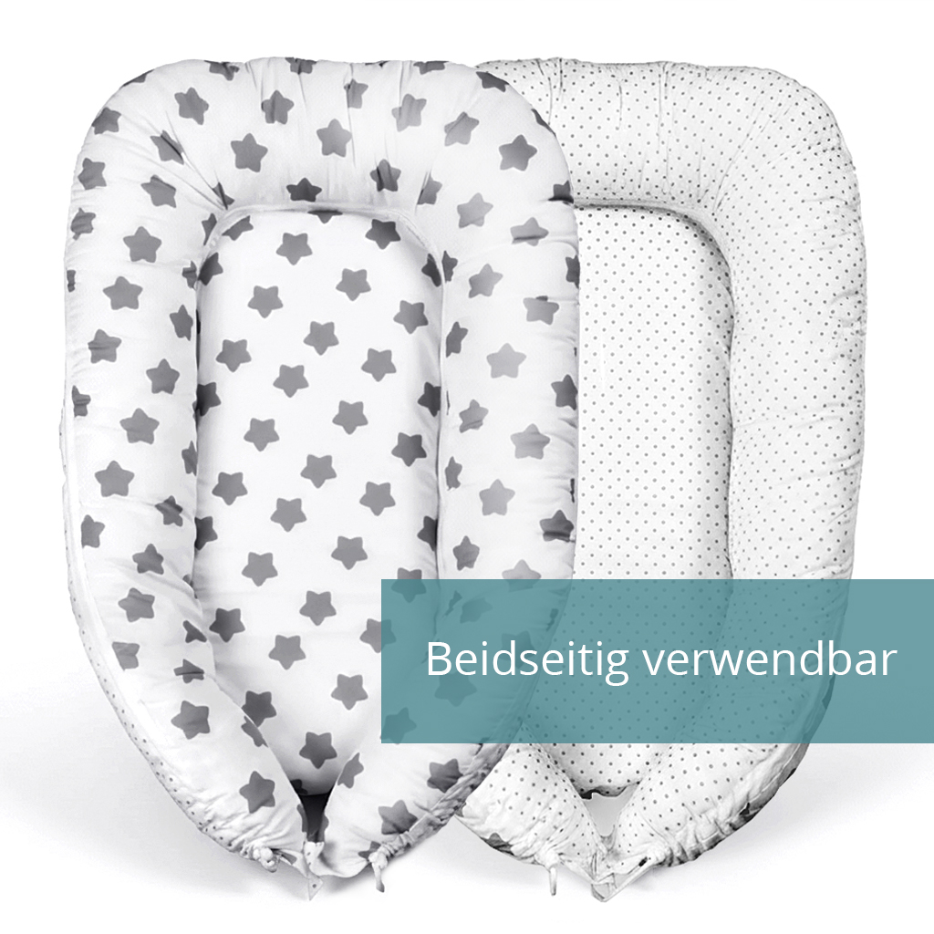 Das Babynest Freya im Wendedesign mit Sternen und Pünktchen ist ein richtiges Multitalent und verfügt über eine Reißverschluss-, Klett- und Zugband-Funktion. Dadurch ist das Babynestchen noch vielseitiger einsetzbar und einfacher zu pflegen.