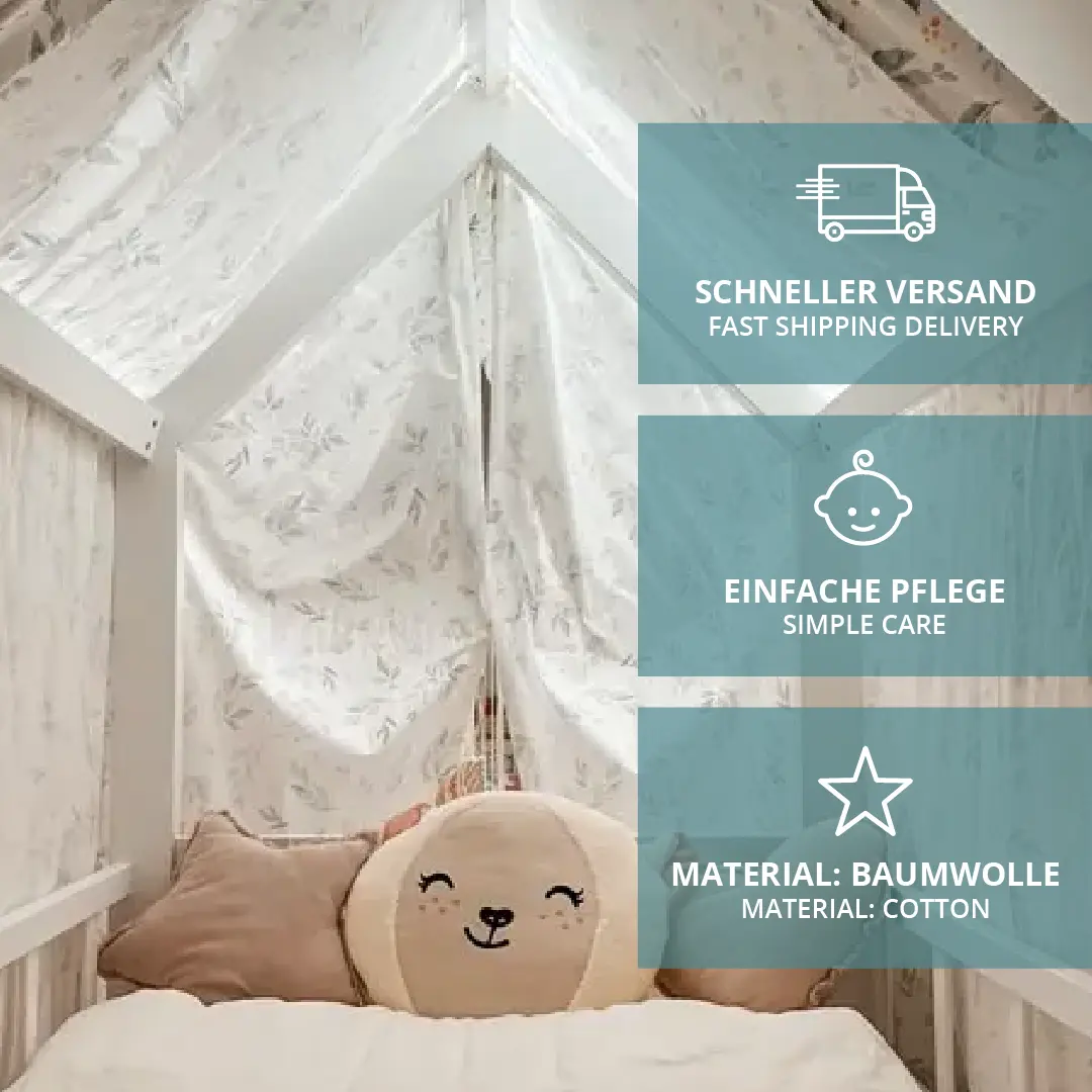 Das 2-teilige Vorhang-Set Linnea mit Pünktchen und Bindebändern verzaubert jedes Hausbett in einen kleinen Kindertraum. Dank der Vorhänge wird eine gemütliche Atmosphäre geschaffen, in der genug Raum zum Kuscheln, Vorlesen oder Verstecken ist.