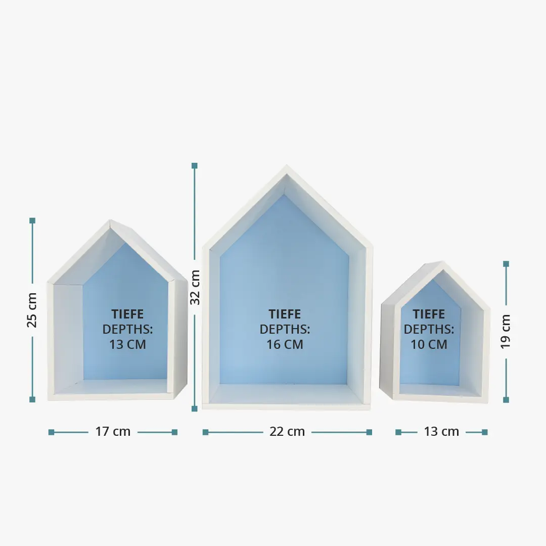 Das Hausregal-Set Elise in blau besteht aus drei Häusern, die sich einfach und schnell als dekoratives Element an der Wand anbringen oder frei stehend auf die Fensterbank oder Kommode stellen lassen. Mit kleinen Spielzeugen, Stofftieren oder Dekoartikeln bestückt, bieten die Häuser zusätzlichen Stauraum und sind ein Hingucker in jedem Baby- und Kinderzimmer. Das Befestigungsmaterial für die Wand ist nicht im Lieferumfang enthalten.