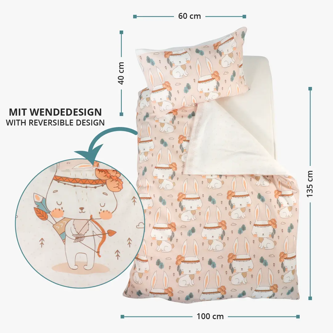 Das weiche Kinderbettwäsche-Set Daina mit Hasen-Motiv verfügt über einen Stoffeinschlag an der Decke und am Kissen für den einfachen Gebrauch. Der Bezug bleibt auch bei aktiven Schläfern an Ort und Stelle. Das Bett-Set hat die Maße 100x135 cm und der Kissenbezug 60x40 cm.
