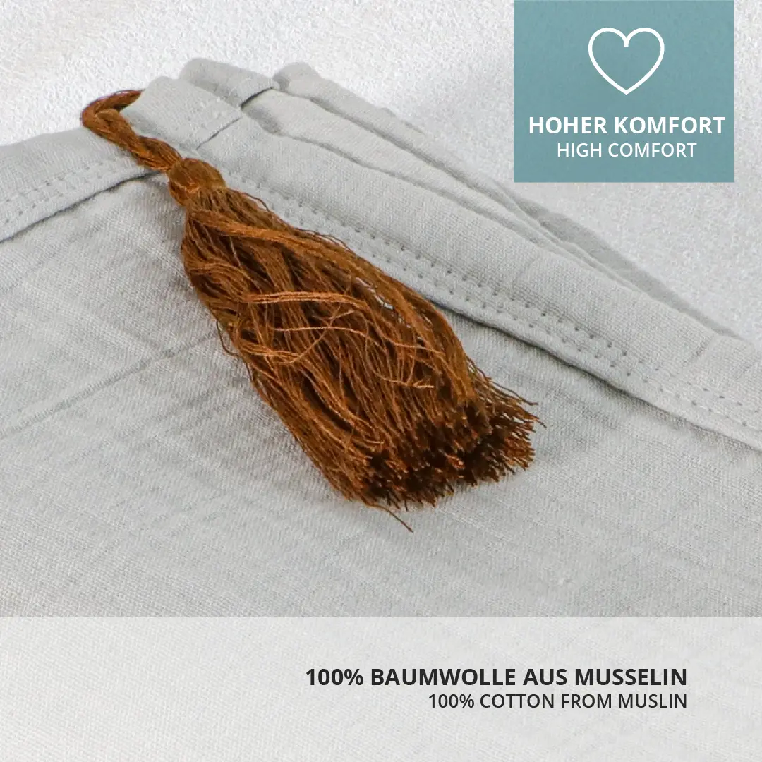 Musselinstoff ist atmungsaktiv, verhindert starkes Schwitzen und sorgt für eine optimale Luftzirkulation.