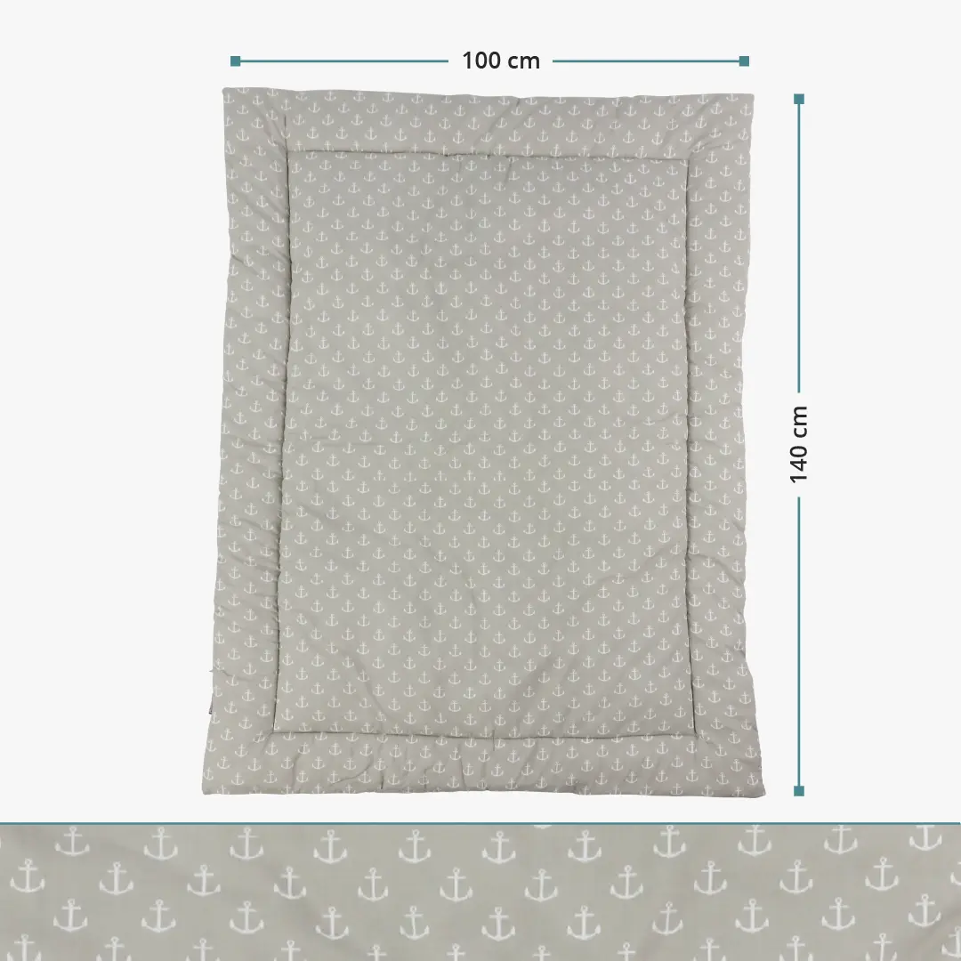 Die Krabbel- und Spieldecke Greta mit Anker-Motiv bietet viel Raum zum Spielen. Das kuschelig weiche Obermaterial besteht zu 100% aus reiner Baumwolle und sorgt für eine optimale Polsterung. Die Decke unterstützt somit das Spielvergnügen des Babys und das auch auf kalten oder unebenen Böden.