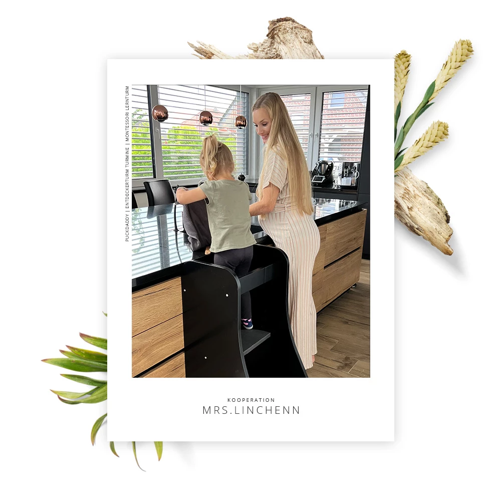 Der Puckdaddy "Entdeckerturm" findet in Linas Küche den richtigen Platz, so dass selbst ihr kleinster Schatz bei der Zubereitung leckerer Speisen helfen kann. Lina hat sich für unseren schwarz lackierten "Entdeckerturm" entschieden, der aus hochwertigem MDF-Holz besteht.