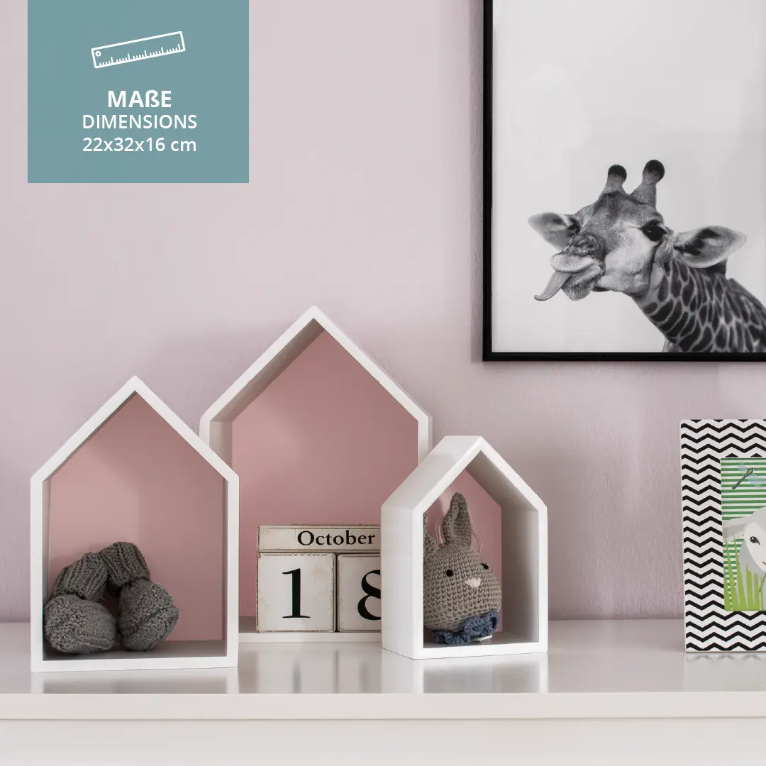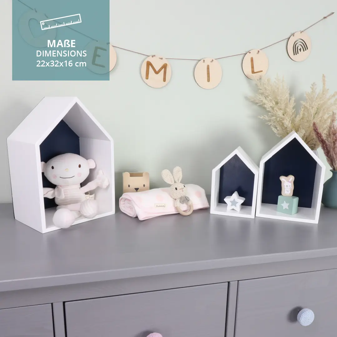 Eine kreative Idee für mehr Ordnung im Kinderzimmer ist es, den Accessoires wortwörtlich ihr eigenes Zuhause zu geben – mit den Hausregalen von Puckdaddy ist das möglich. Die Regale, die Du in praktischen 3er-Sets erhältst, kannst Du an der Wand anbringen oder aber auch freistehend platzieren, z.B. auf der Fensterbank oder auf einem Tisch und so für Farbtupfer im Raum sorgen.