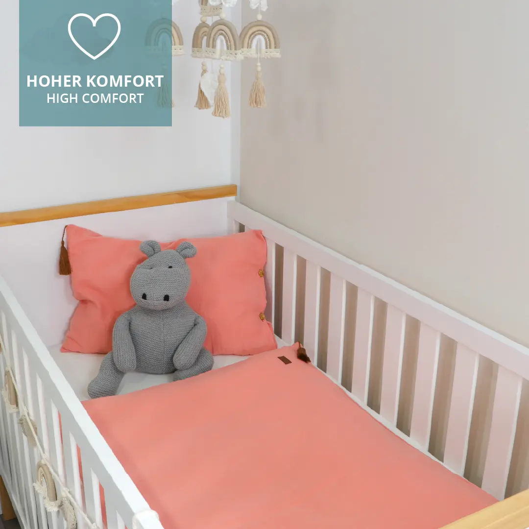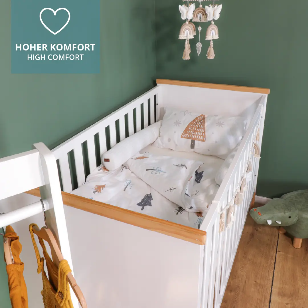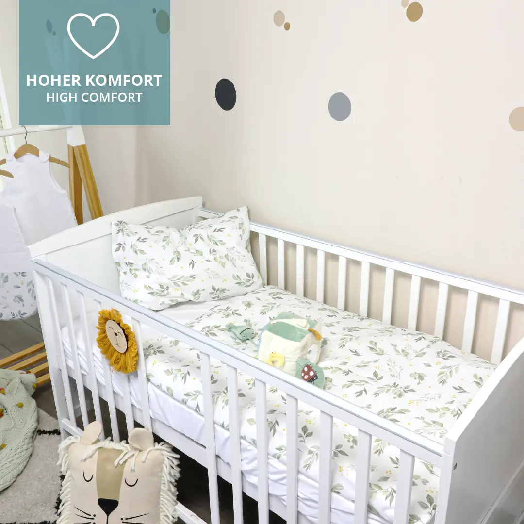 Für einen guten Schlaf ist neben einer guten Matratze auch die richtige Bettwäsche ausschlaggebend für das Wohlbefinden Deines Kindes. Für Babys und Kleinkinder sind daher die Verwendung hochwertiger und reiner Baumwollmaterialien von hoher Bedeutung. Unsere Bettwäsche-Sets mit Kopfkissen und Bettdeckenbezug schmiegen sich angenehm an die Haut an. Wie alle unsere Textilen sind auch unsere Bettwäschen mit einen OEKO TEX 100 Standard ausgezeichnet.
