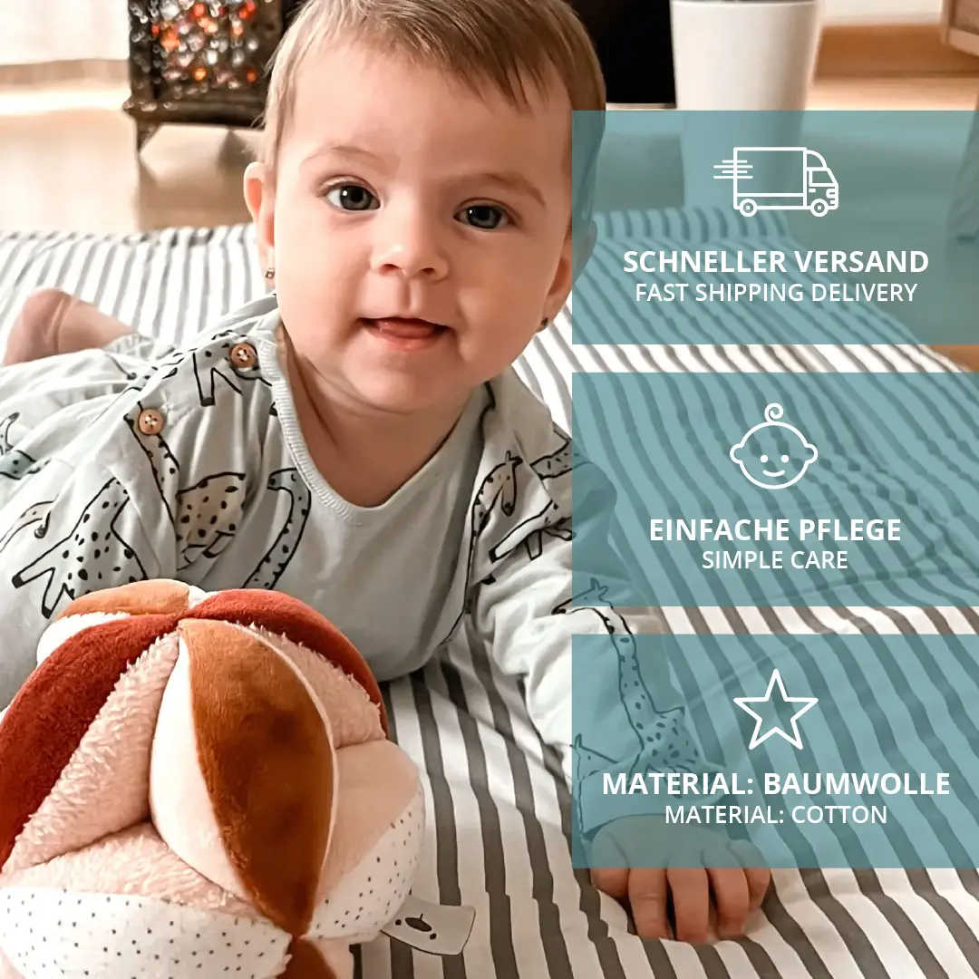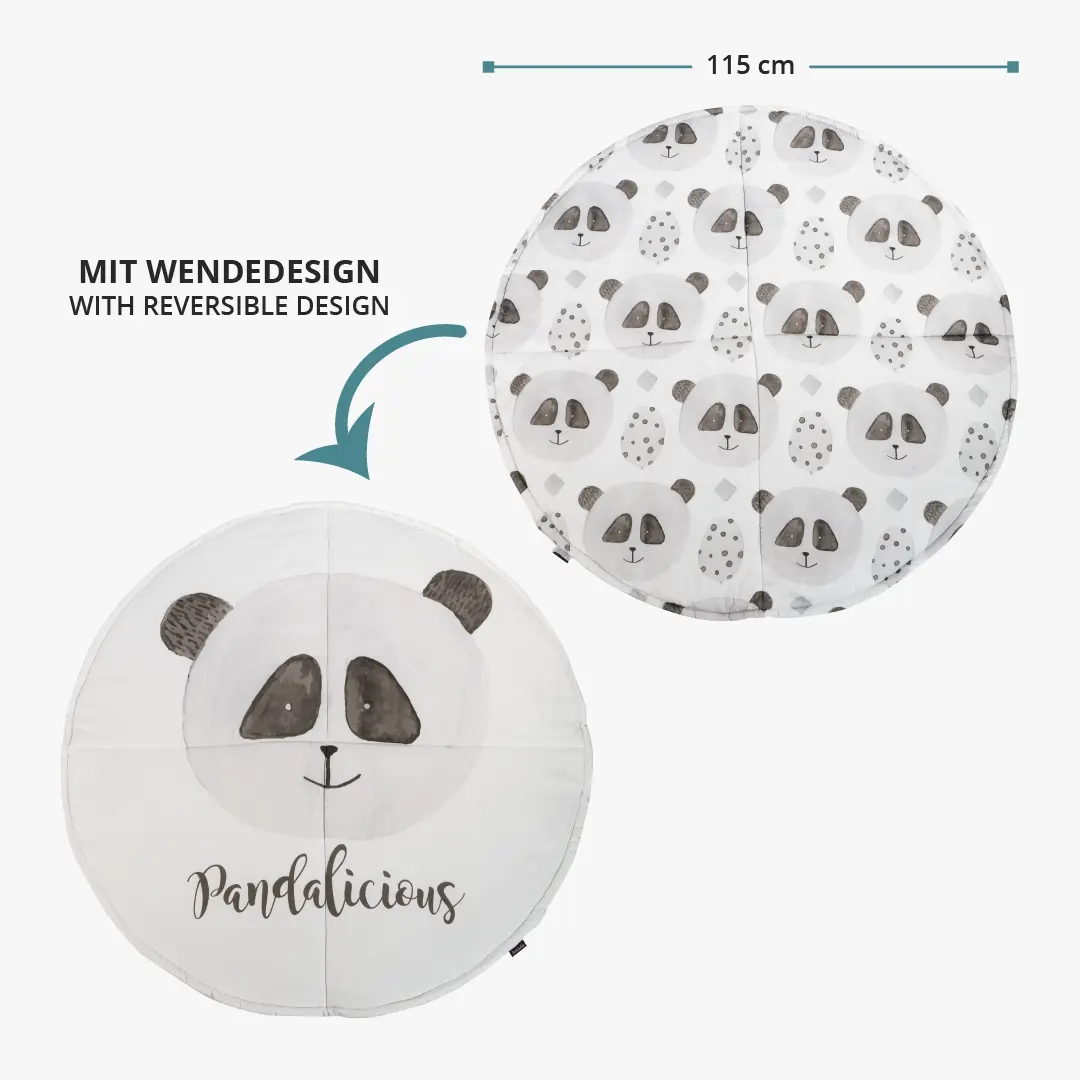Die Krabbel- und Spieldecke Vala mit Panda-Motiv im Wendedesign bietet viel Raum zum Spielen. Das kuschelig weiche Obermaterial besteht zu 100% aus reiner Baumwolle und sorgt für eine optimale Polsterung. Die Decke unterstützt somit das Spielvergnügen des Babys und das auch auf kalten oder unebenen Böden.