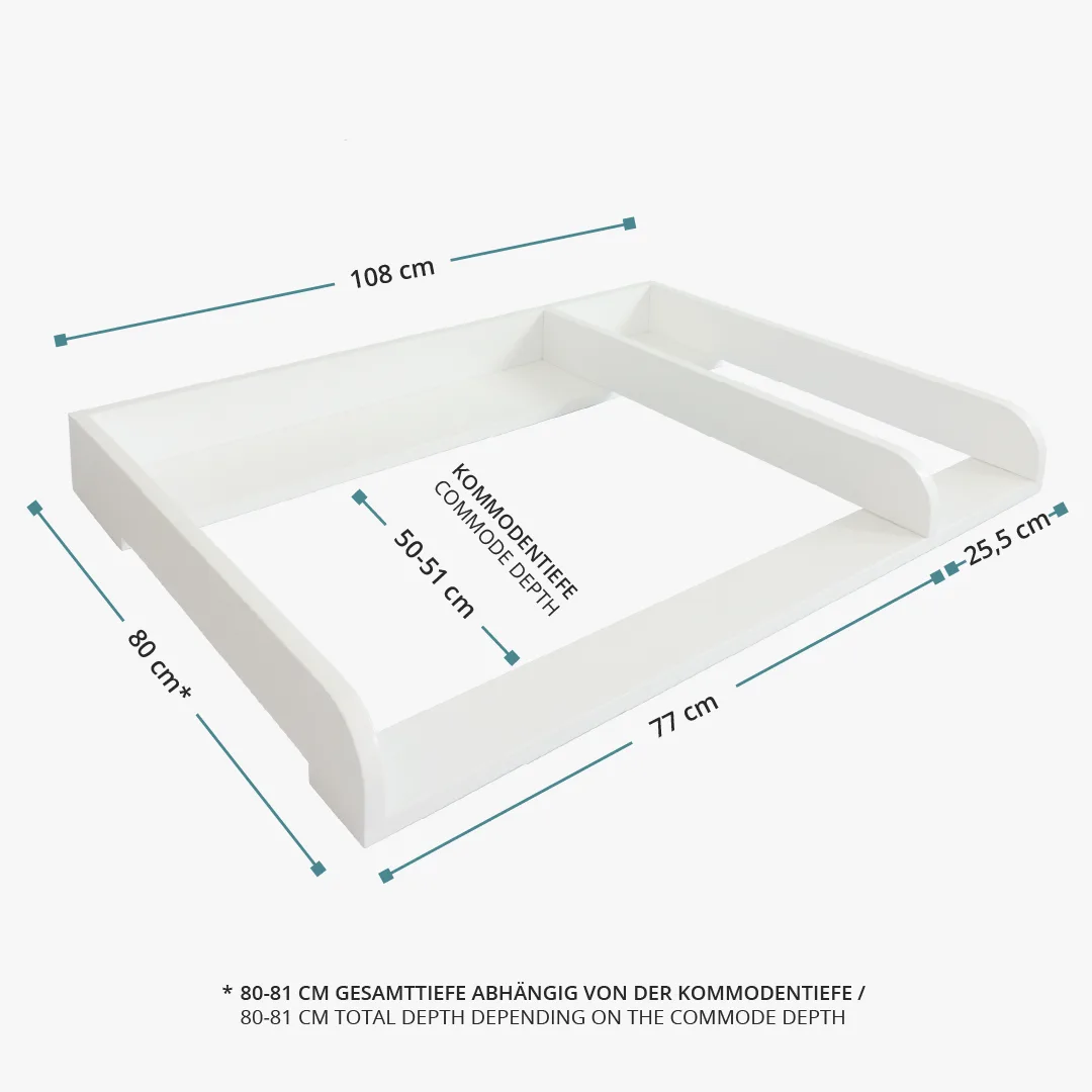 Der weiß lackierte Wickelaufsatz mit abgerundeten Kanten schließt bündig mit der Kommode ab und verfügt über ein Trennfach, welches sowohl rechts als auch links angebracht werden kann. So sind alle wichtigen Wickelutensilien immer gut organisiert und griffbereit. Mit einer Liegefläche von 77x78 cm bietet der Wickelaufsatz viel Platz beim Wickeln.