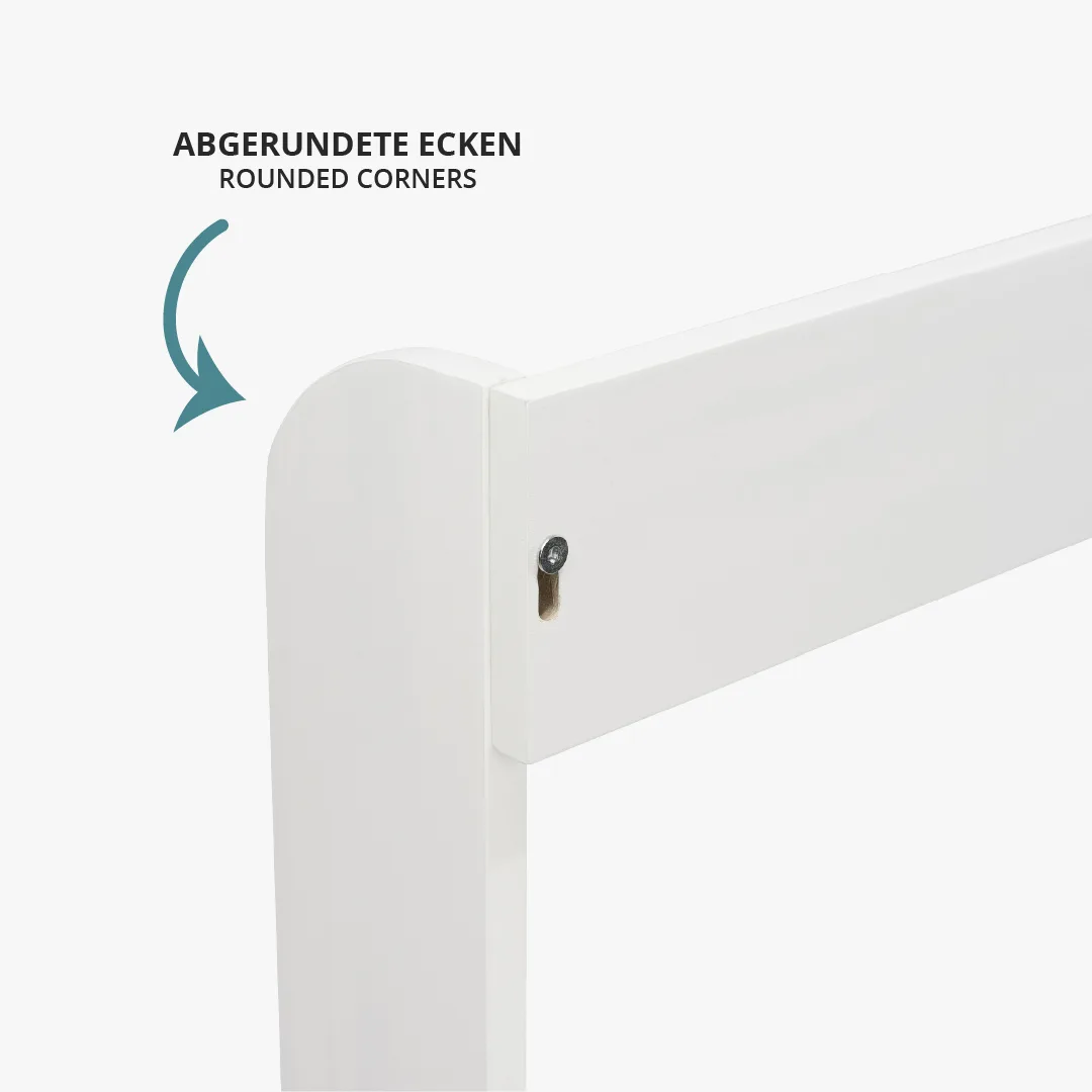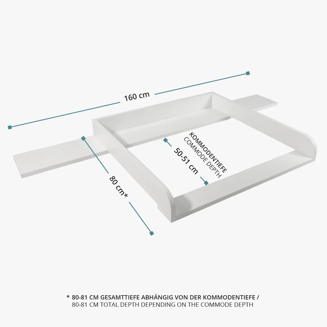 Dank der integrierten Blende schließt der Wickelaufsatz bündig mit der Wand und der Kommode ab und schafft zusätzliche Ablagefläche. Der weiß lackierte Wickelaufsatz verfügt über abgerundete Kanten. Mit einer Liegefläche von 77x78 cm bietet der Wickelaufsatz viel Platz beim Wickeln.